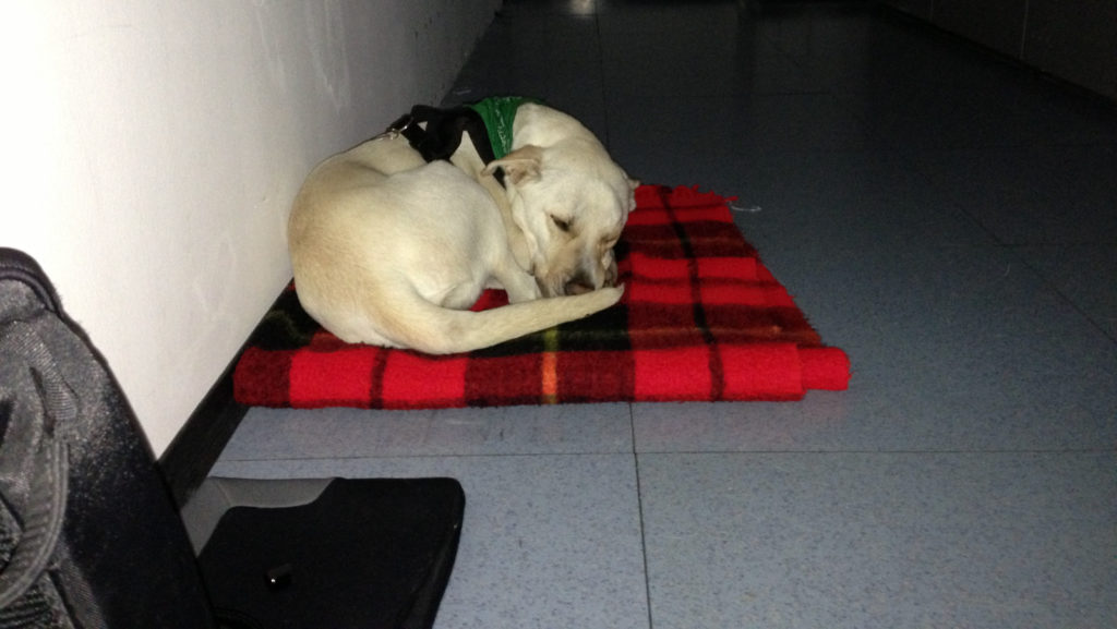 Als ich das erste mal ins Büro fahren musste (ca. eine Woche nachdem er zu uns kam), nahm ich ihn mit. Ich musste in einem Serverraum einen Router konfigurieren, Rocko störte das nicht, solange eine Decke für ihn bereitlag.